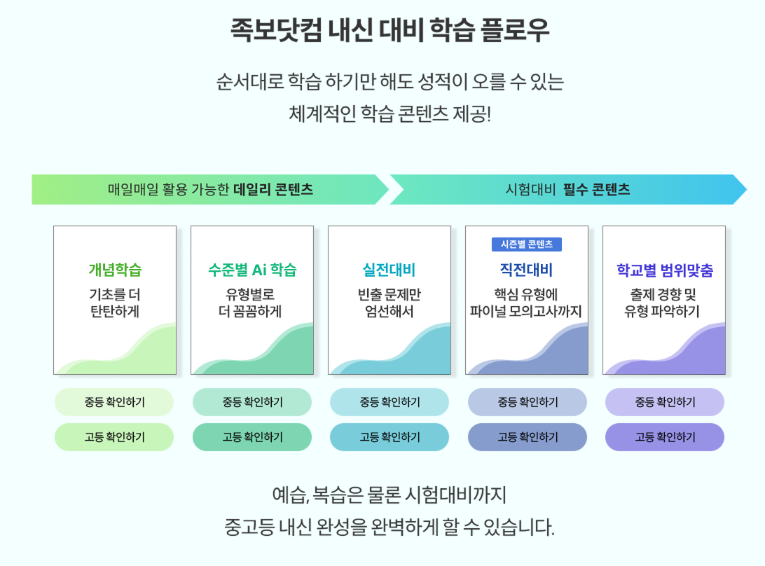 중학교 1학년부터 내신의 중요성을 인지하고 공부를 시작한 학생에게는 내신코치가 장기적으로 안정적인 기반을 제공할 수 있고, 반면 고등학교 2~3학년처럼 내신에 대한 즉각적인 성과가 필요한 경우라면 족보닷컴의 집중 훈련이 훨씬 효과적일 수 있습니다.